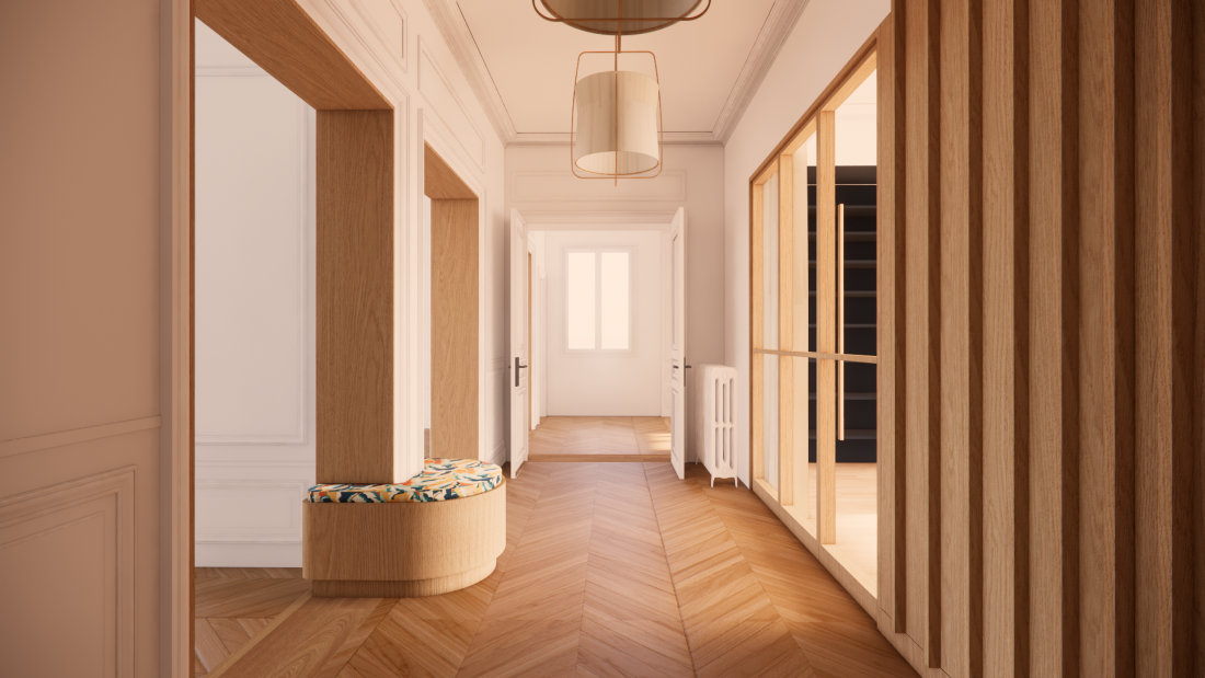Aménagement sur mesure d’une entrée, d’une salle de réception et Conseil en Décoration pour une circulation entre la zone jour et la zone nuit pour un appartement rénové par l’agence en 2021